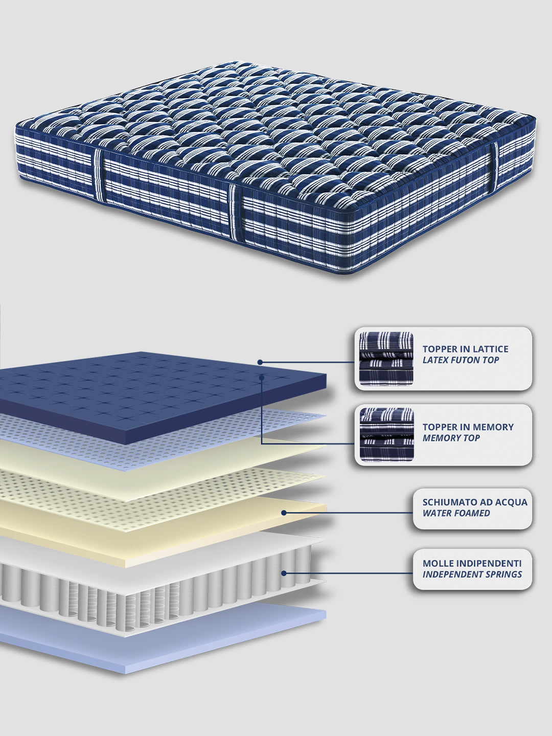 TOPPER IN MEMORY 3 cm di MEMORY SOIA DS50KG/M3, racchiuso da un lussuoso tessuto trapuntato con 1,5 cm di MALVA FOAM SUPERSOFT e fibra anallergica da 250grm2