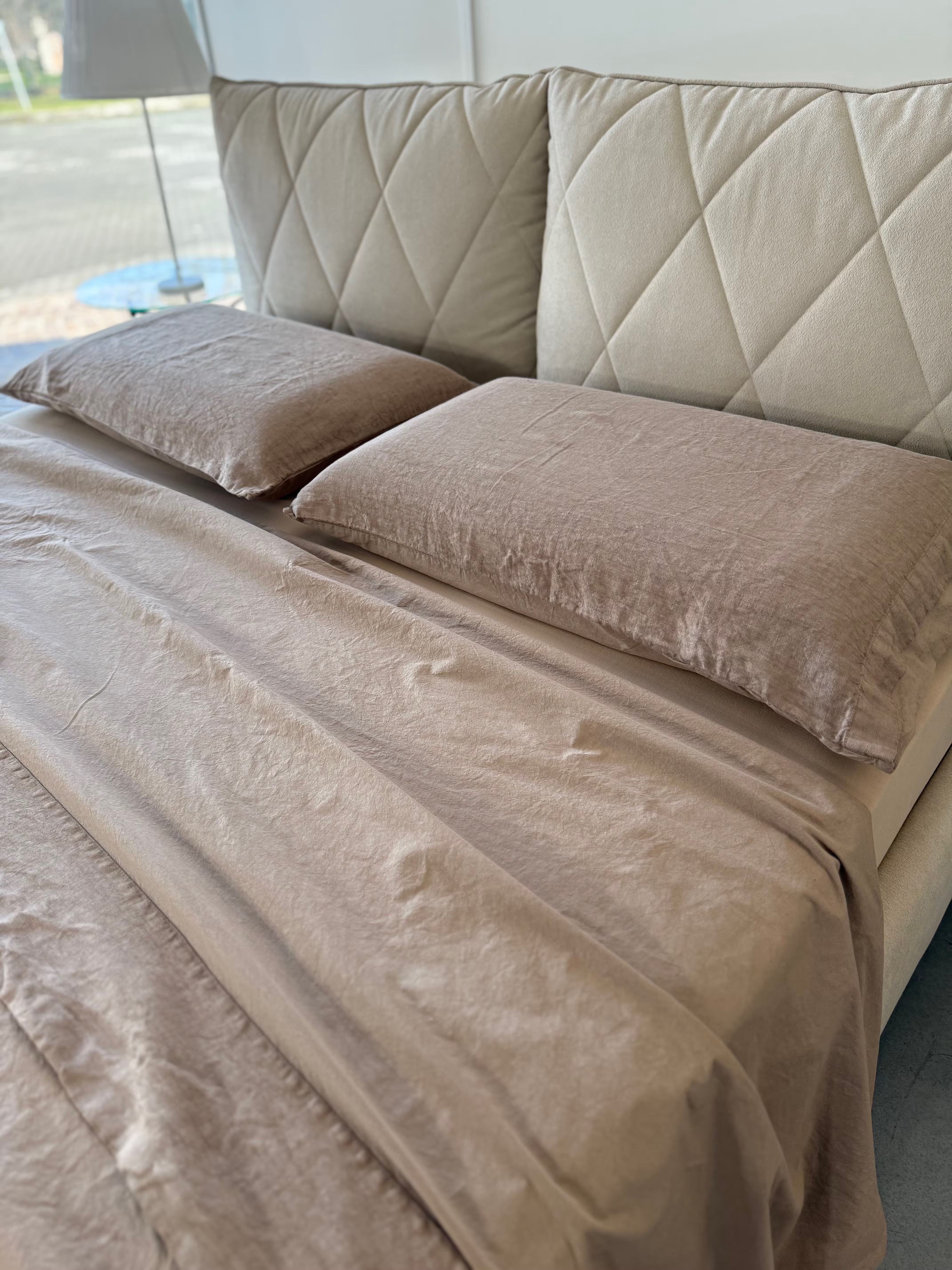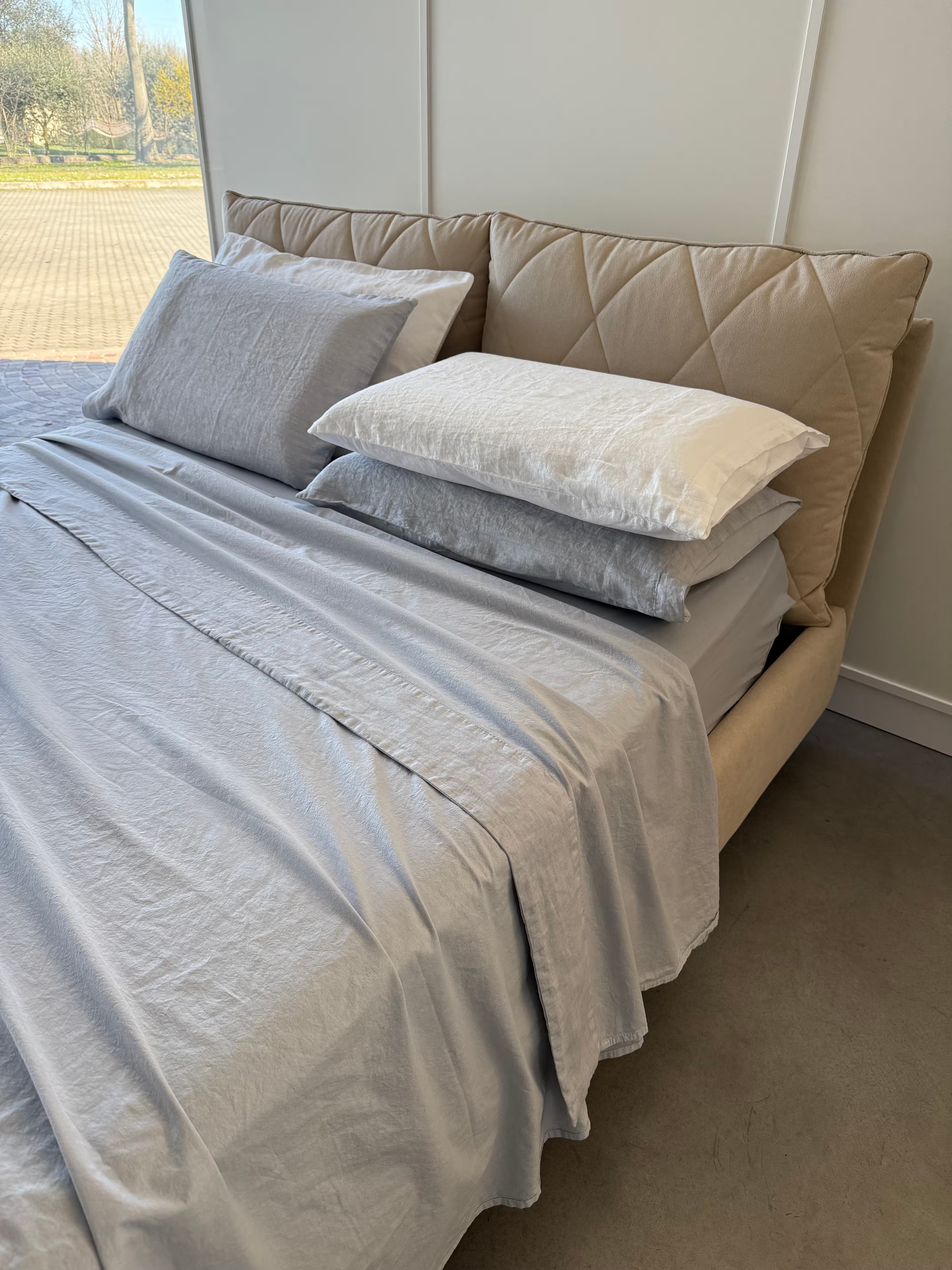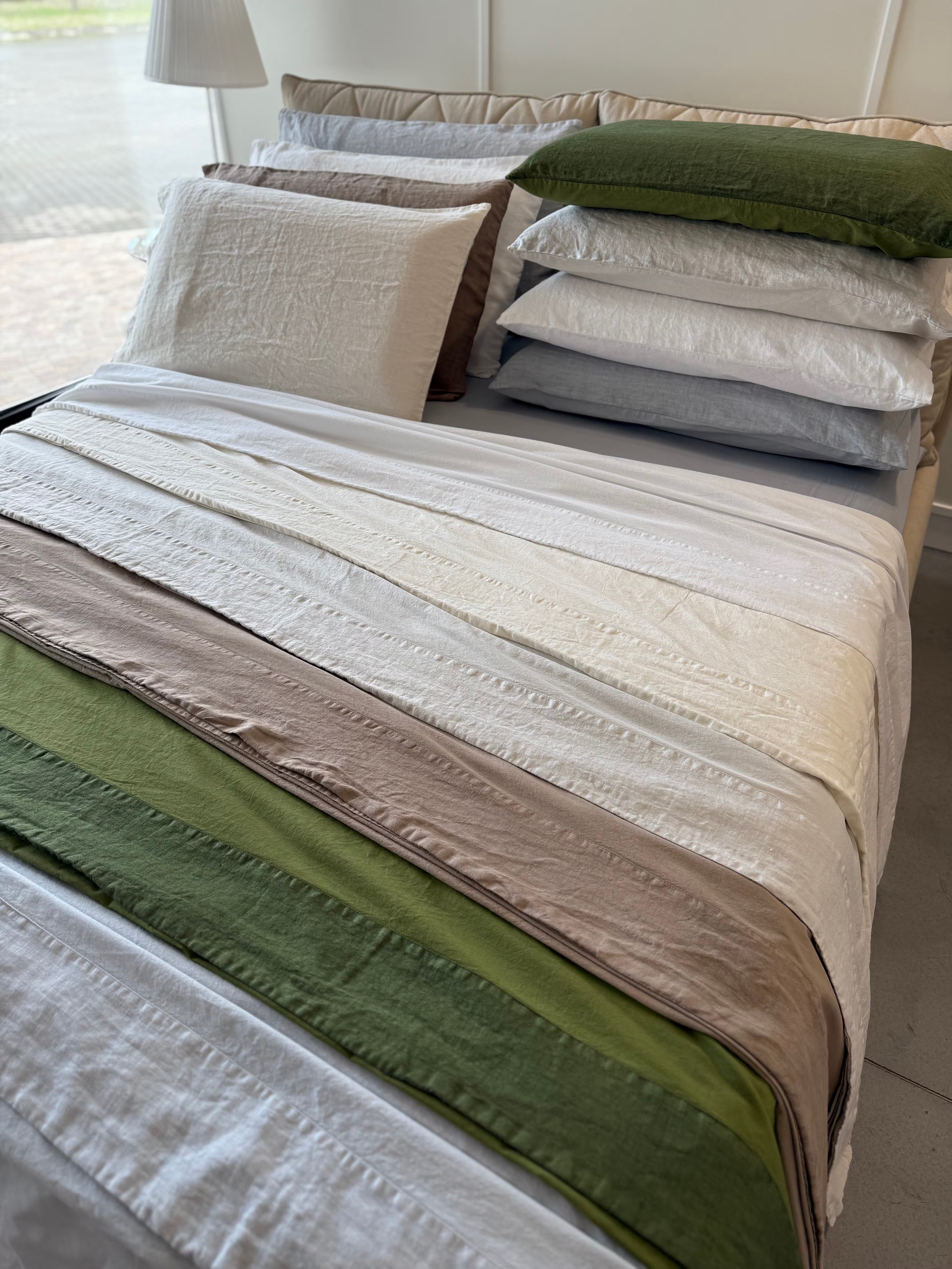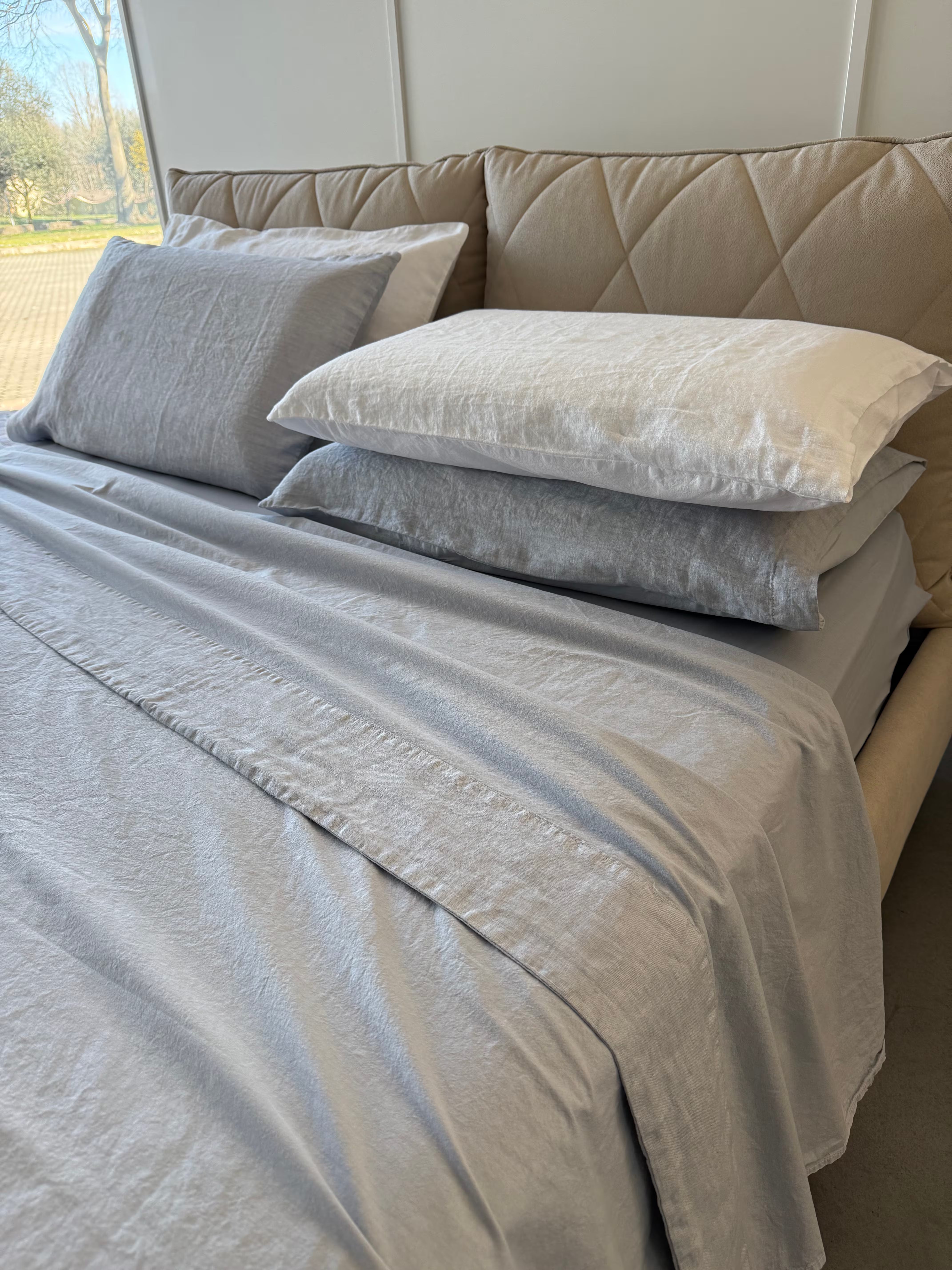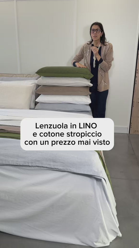 Raffinato, elegante e pratico è il nostro lenzuolo in cotone stonewashed Elegance con bordo in puro Lino, federe un lato puro Lino ed un lato cotone stonewashed.